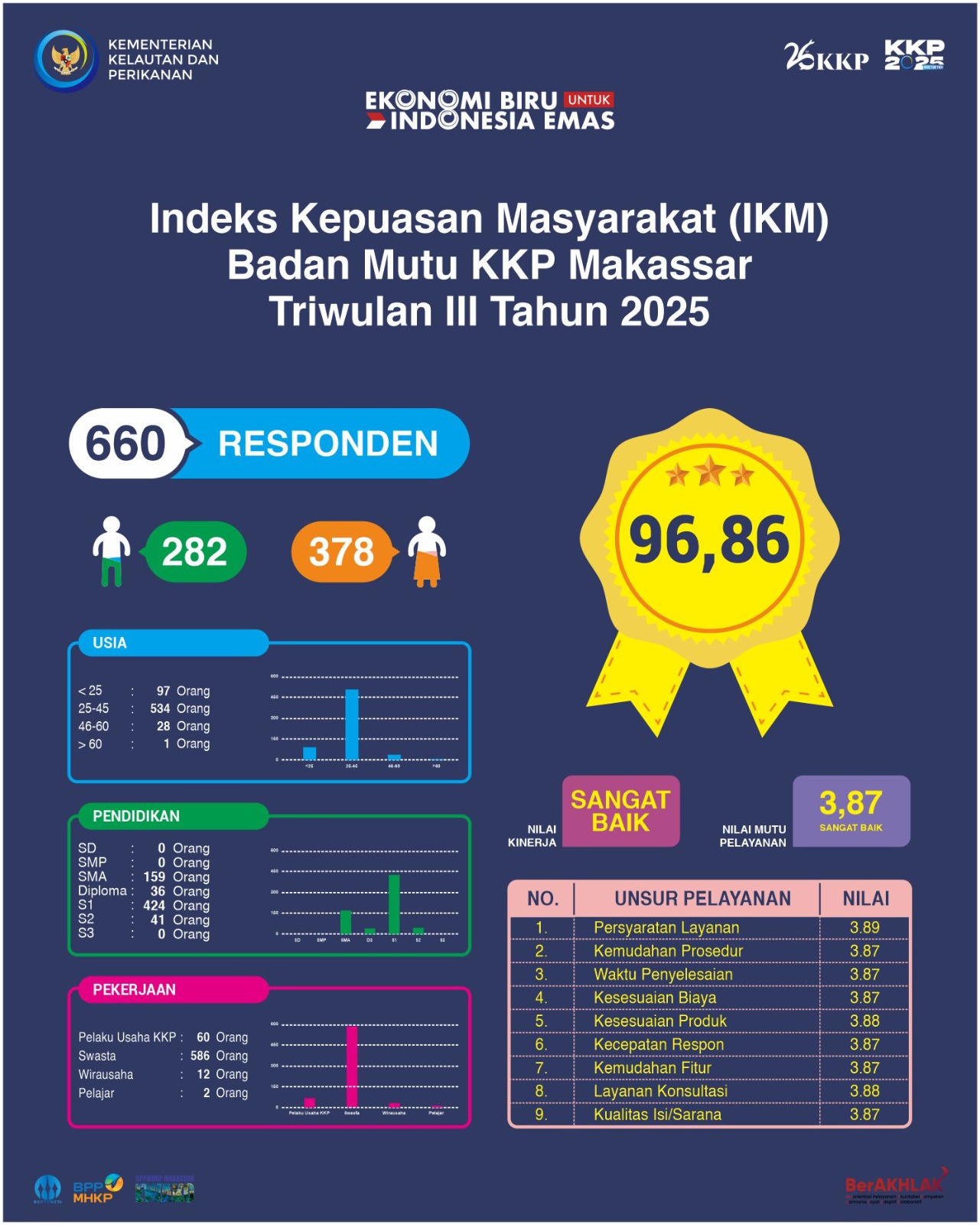 Pada Triwulan III Tahun 2025, Badan Mutu KKP Makassar telah melaksanakan Survei Kepuasan Masyarakat untuk periode 01 Juli – 30 September 2025 secara online. Sebanyak 660 responden berpartisipasi pada Survei Kepuasan Masyarakat ini. Hasilnya, Indeks Kepuasan Masyarakat Badan Mutu KKP Makassar Triwulan III Tahun 2025 sebesar 96,86 (kategori SANGAT BAIK).
